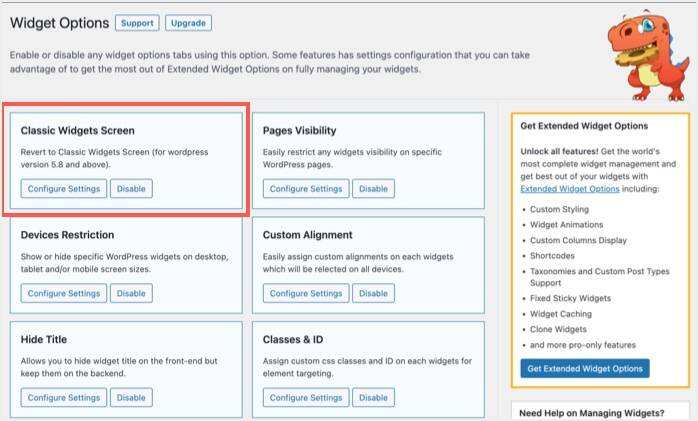 - 这将禁用Gutenberg小工具区块并启用经典小工具界面。您在页面上确实很少有其他设置来控制页面可见性、添加自定义CSS类等,您可以根据需要进行配置。