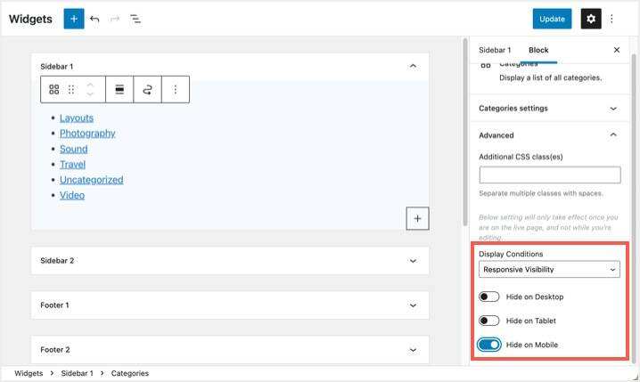 同样,要隐藏区块小工具,请导航到“外观 > 小工具”部分。选择任何小工具并从“显示条件”中设置“在移动设备上隐藏”以隐藏该区块。