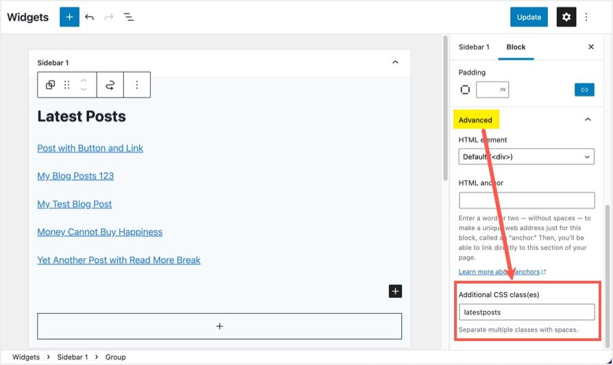 - 在“Additional CSS class(es)”文本框下添加您的CSS类名称。例如,在我们的案例中,我们将添加类名作为latestposts。