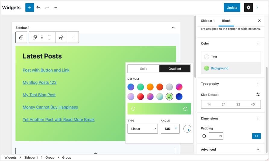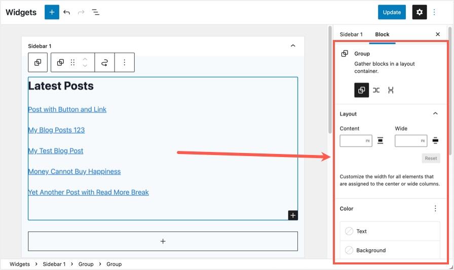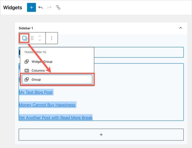 - 选择“分组”选项将您的标题和最新文章区块分组为单个区块小工具。