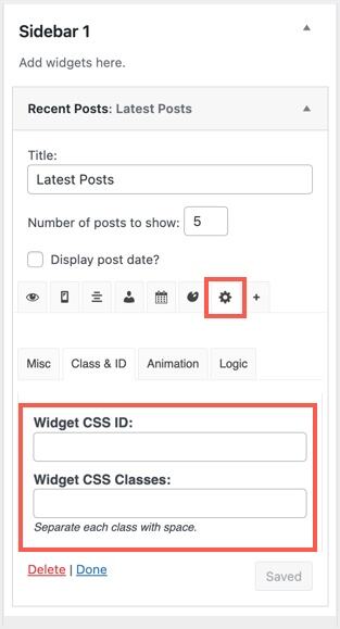 最后一个选项是使用插件来设置小工具的样式。如果您使用的是经典小工具编辑器,请尝试使用Widget Options插件。这将为每个小工具添加自定义选项,如下图所示。单击齿轮图标并添加您的自定义CSS类或ID。之后,您可以在定制器部分添加您的样式,如上所述。
