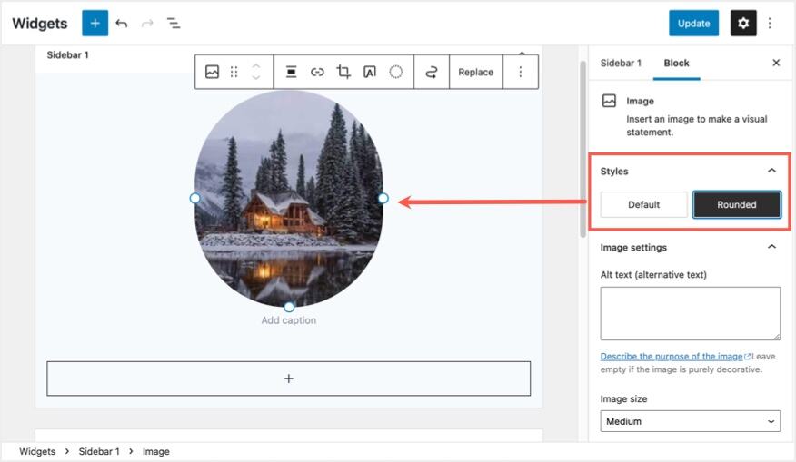 注意:确保为分组区块选择“Group”选项,而不是“Widget Group”选项。虽然您可以将自定义CSS类添加到小工具组,但它似乎并不像我们测试的那样工作。此外,像图像这样的一些区块提供“样式”设置来应用圆角或方角,而无需添加额外的CSS类。