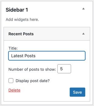 - 转到“外观>小工具”部分,添加“最近的文章”小工具。提供标题为“最新文章”,然后单击“保存”按钮。我们将在这里解释“最近的文章”小工具,这是经典小工具编辑器屏幕上可用的小工具。