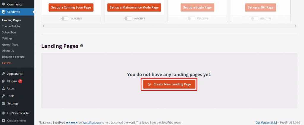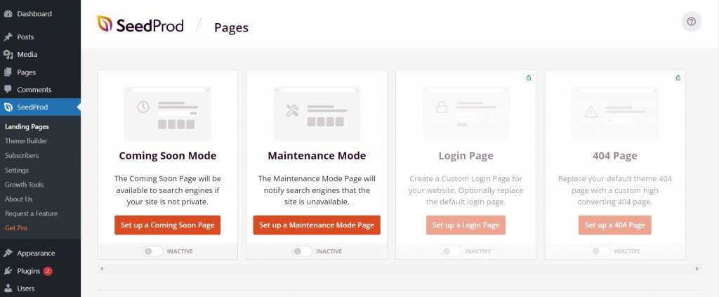 激活插件后,您将被重定向到SeedProd着陆页仪表盘。在页面顶部,将有四个着陆页选项。