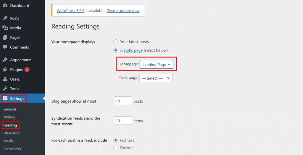 转到设置->阅读,然后从主页下拉菜单中选择您为着陆页创建的页面名称。然后,单击保存更改。