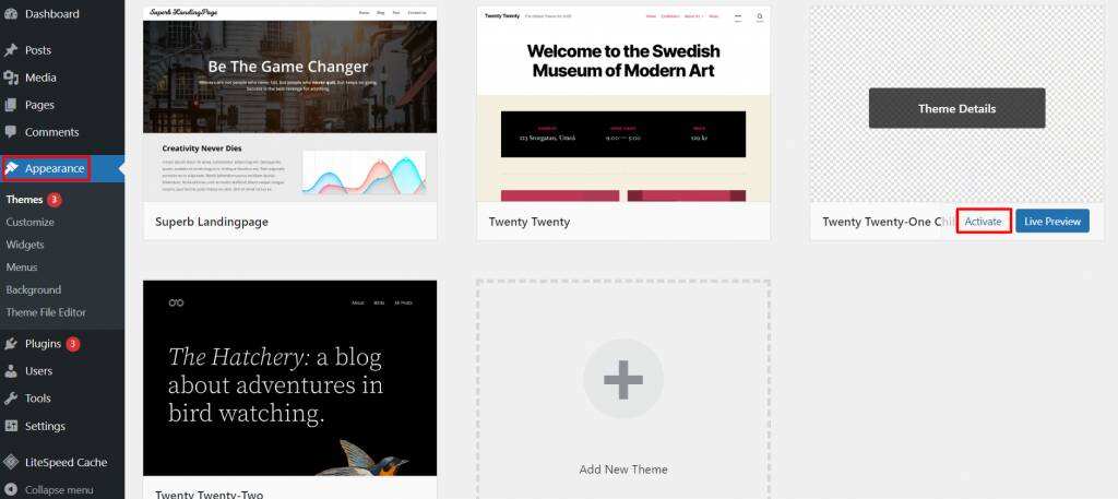 您的子主题现在可以使用了,所以转到您的 WordPress 管理区域并单击外观->主题->启用。