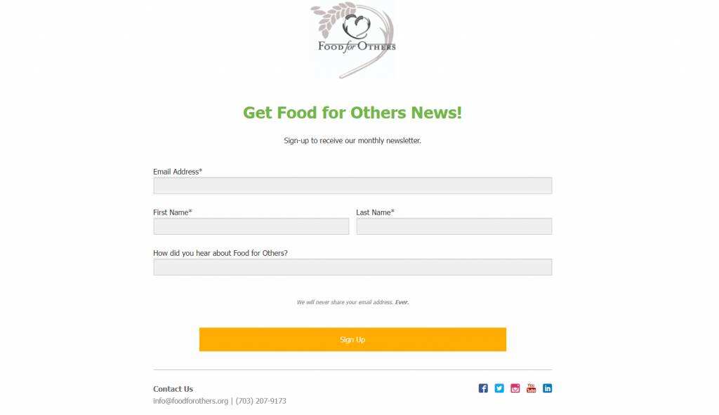 例如,查看Food for Others的订阅通讯着陆页,该页面具有简单干净的布局和清晰的标题。凭借其无干扰的着陆页,网站访问者可以轻松专注于内容。