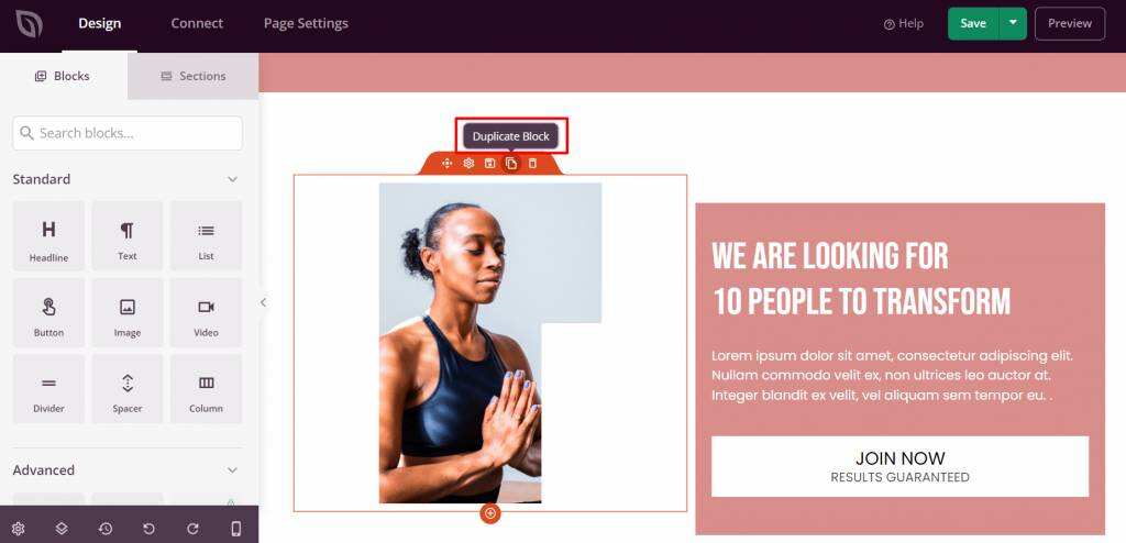 如果要复制区块,请单击鼠标悬停时出现的文件图标。还有其他用于删除、移动和保存区块的图标来简化您的设计过程。