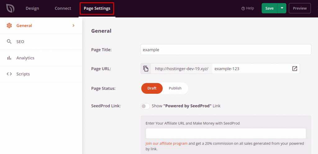 如需进一步自定义,您可以通过“Page Settings”选项卡配置您的常规页面、SEO和分析设置。