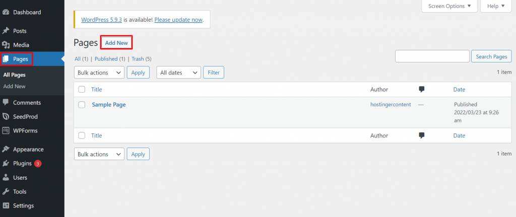 - 设置主题后,转到页面 -> 新建页面以创建着陆页。或者,从页面顶部的+ 按钮 ->页面添加新页面。