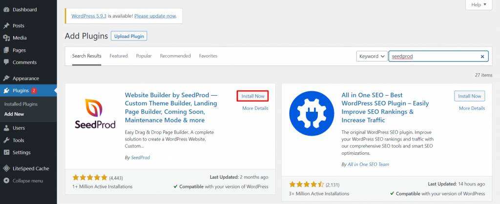 首先,您需要登录您的WordPress仪表盘,转到插件-> 安装插件,然后使用搜索框找到SeedProd插件。然后,在您的WordPress网站上安装并激活该插件。