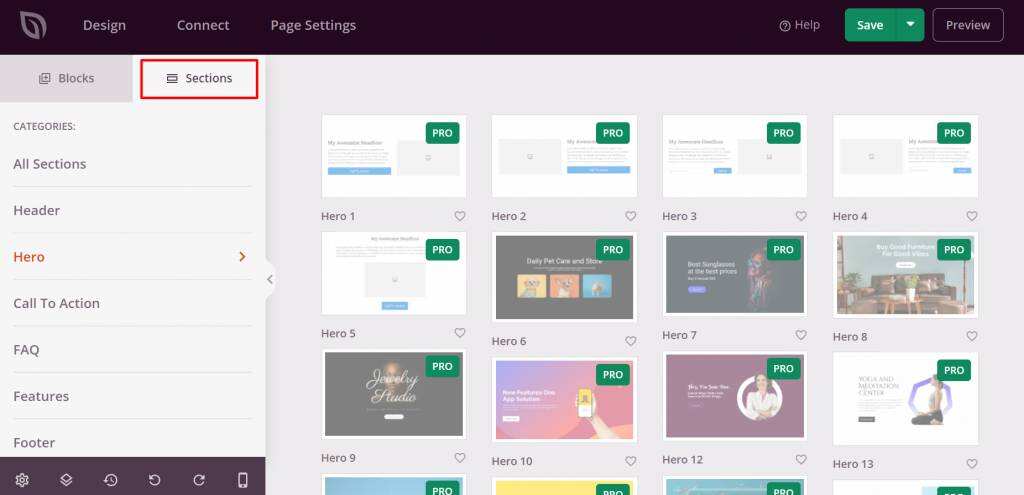 此外,SeedProd的“Sections”菜单为着陆页设计提供了许多类别选项,包括标题、Hero、号召性用语和常见问题解答。