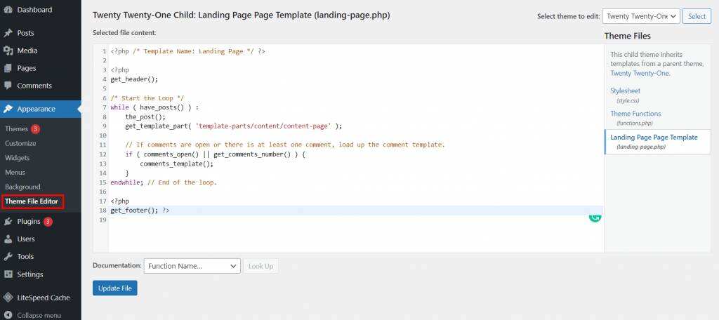 首先,复制以get_header()开头的现有代码;父主题的page.php文件中的一行——它将位于public_html -> wp-content -> Themes -> yourtheme。将其粘贴到您的landing-page.php文件并保存更改。这是您的代码应如下所示: