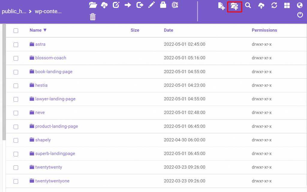 然后,导航到网站根目录 -> wp-content ->themes,单击右上角的新建文件夹,然后为您的子主题输入名称。
