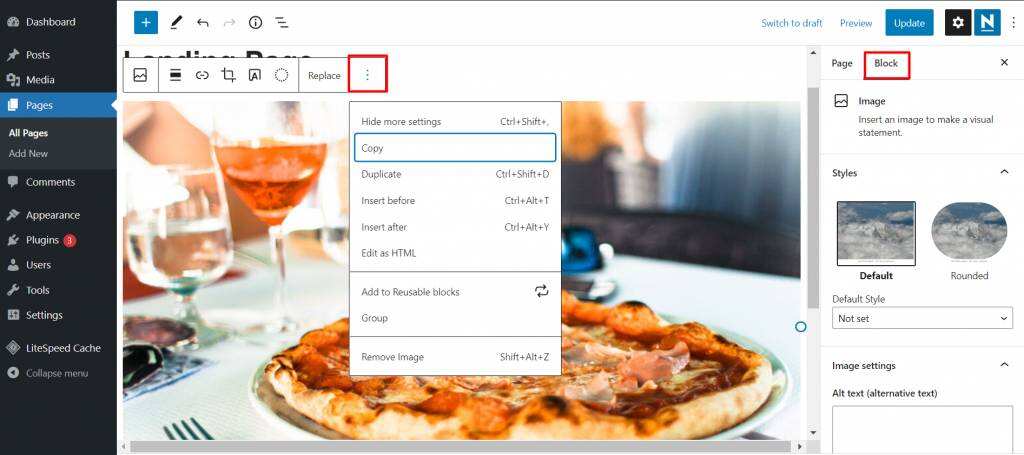 添加区块后,您可以通过侧边栏的“区块”选项卡或单击其上方的三个垂直点对其进行编辑。
