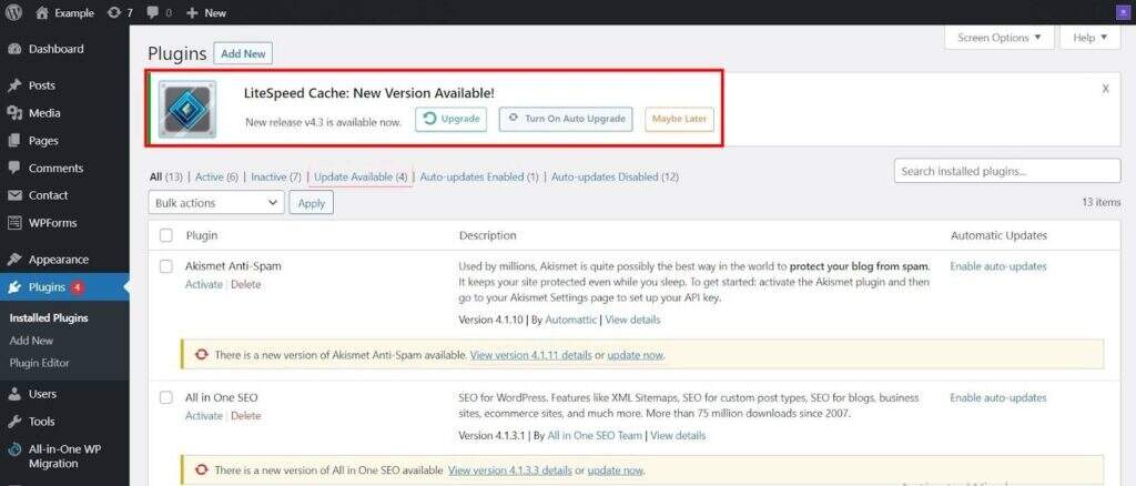 如果您不确定该过程,请查看我们关于更新WordPress核心、主题和插件的教程,而不会有数据丢失的风险。这些步骤包括创建站点数据库的备份以及在执行更新时临时禁用插件。