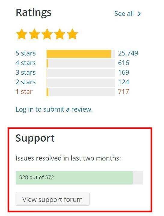 - 支持选项卡。一个有信誉的插件有一个活跃的支持论坛。您还可以查看已解决的问题数量,以衡量插件的可靠性。
