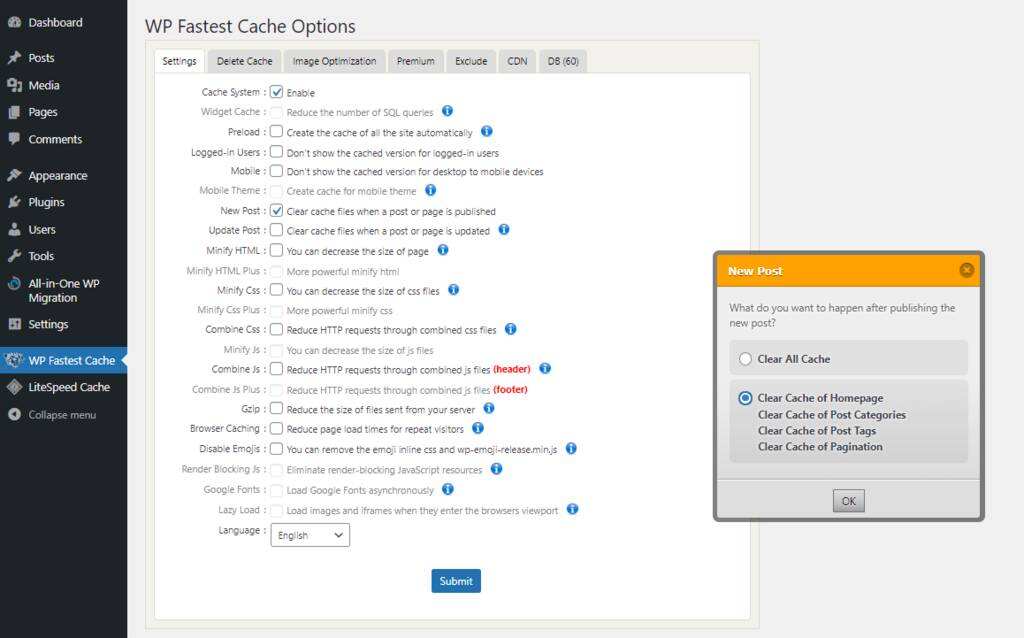 WP Fastest Cache可以清除整个网站内容或单个文章和页面的缓存。此外,当您创建新内容或更改页面或文章时,此缓存插件可以自动清除缓存。