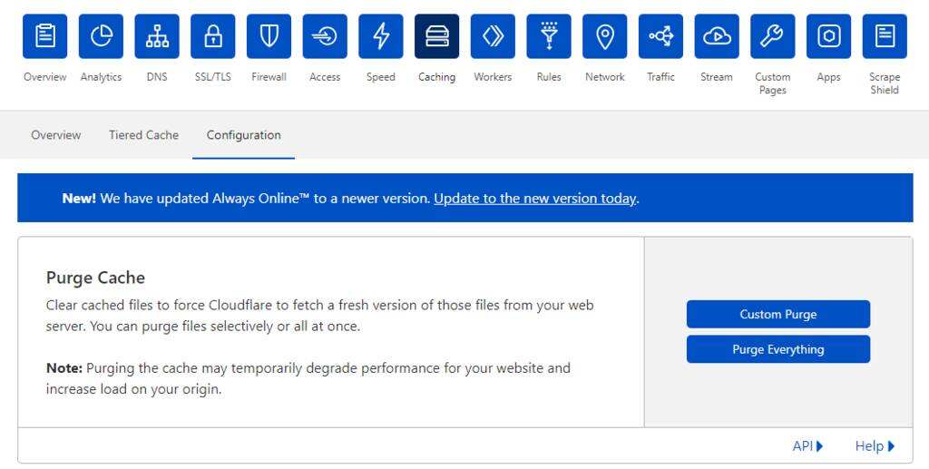 不同的WordPress CDN有自己的清除缓存的方式。例如,有两个选项可以使用Cloudflare清除缓存。首先,登录您的Cloudflare帐户并前往Caching -> Configuration。