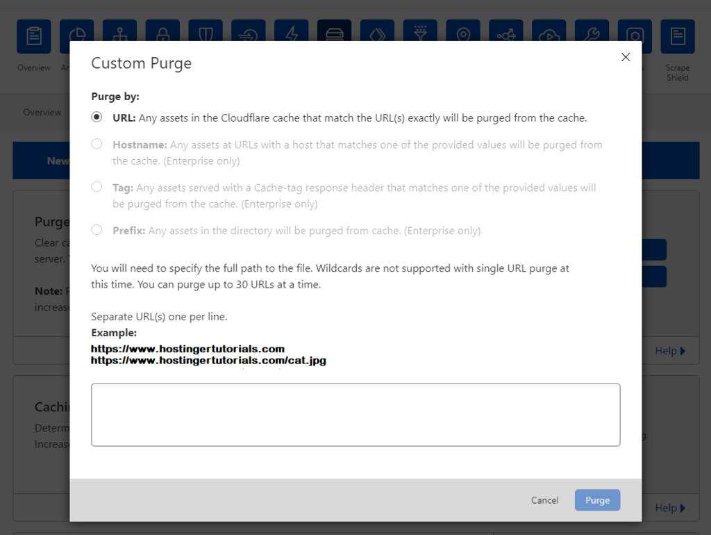 如果您只想清除特定网页的缓存,请单击Custom Purge并插入URL。单击Purge以完成该过程。在弹出框中,输入最多30个要清除的页面或文件。
