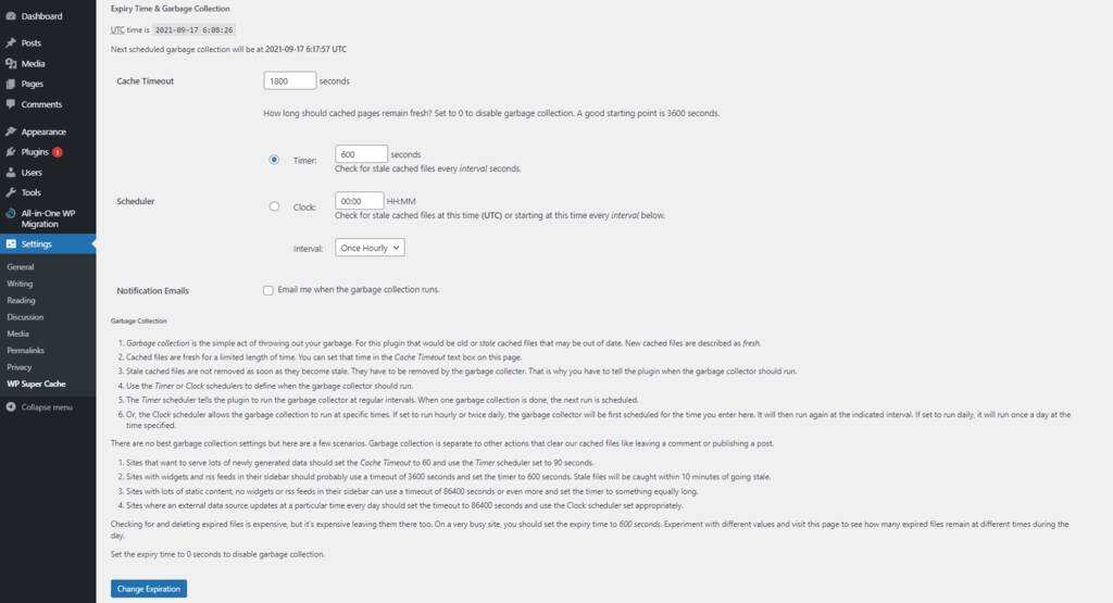 滚动到Expiry Time & Garbage Collection,并相应地设置Cache Timeout。将其设置为3600适合大多数站点,但那些流量大的站点可以将其降低到1800。单击Chage Expiration以完成该过程。