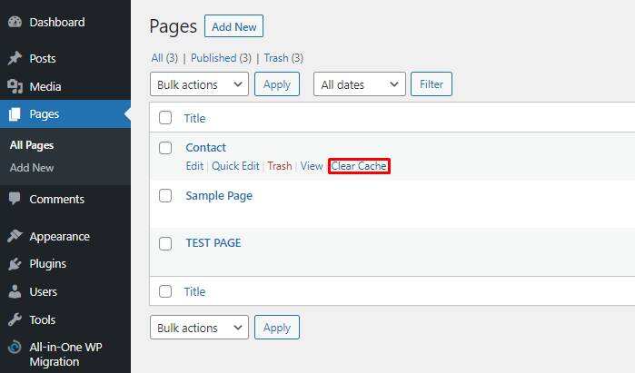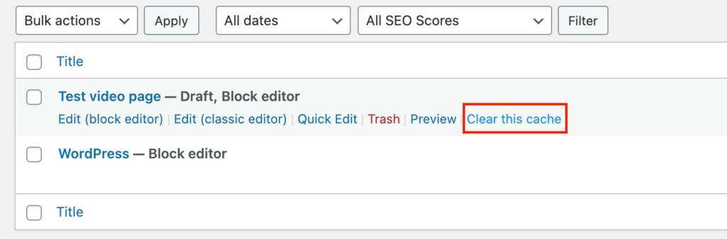 要清除特定文章或页面上的缓存,请将鼠标悬停在其标题上并单击Clear Cache。