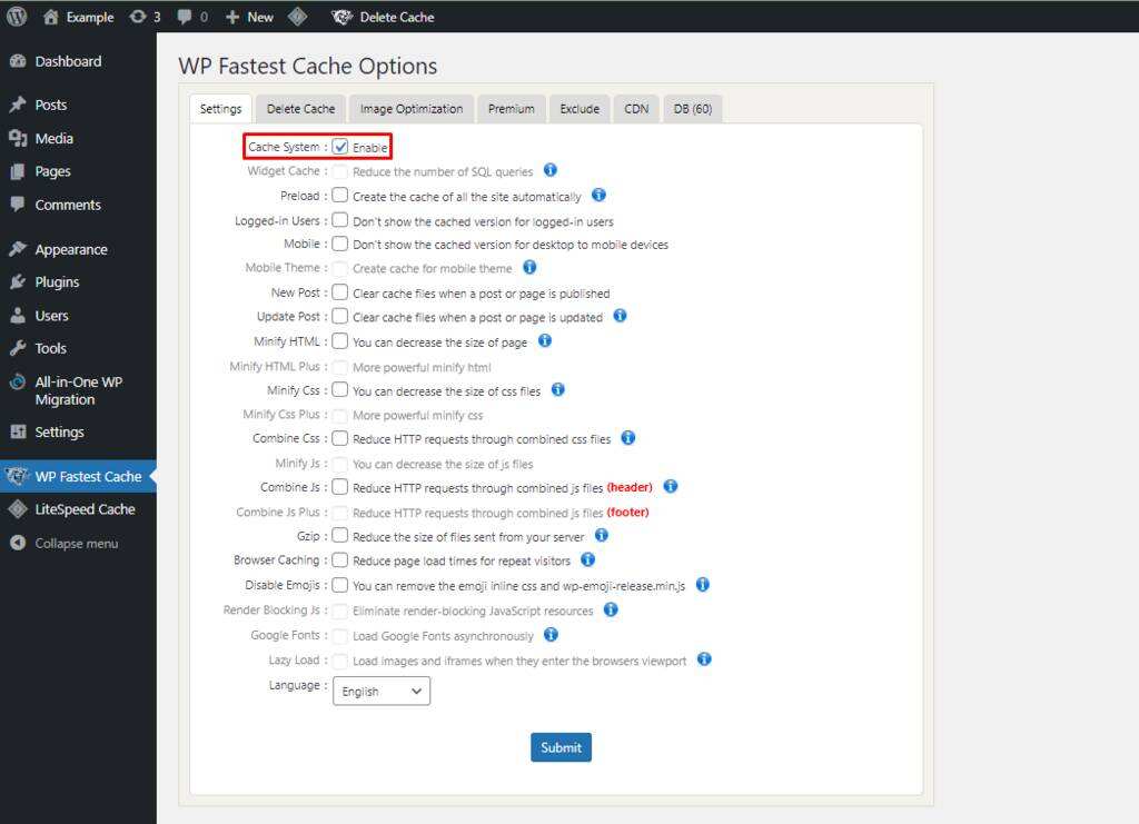 要清除WordPress网站缓存,请前往仪表盘上的WP Fastest Cache。从那里,勾选Cache System旁边的框以定期清除缓存。