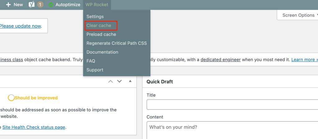 另一个选择是转到WordPress工具栏并单击WP Rocket -> Clear cache。