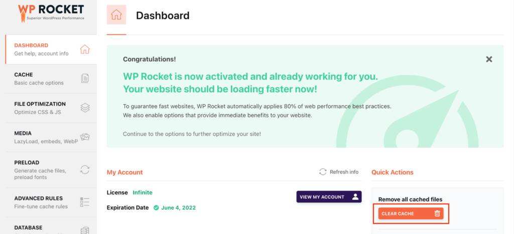 要清除整个 WordPress 站点的缓存,请前往设置 -> WP Rocket -> DASHBOARD,然后单击清除缓存按钮。