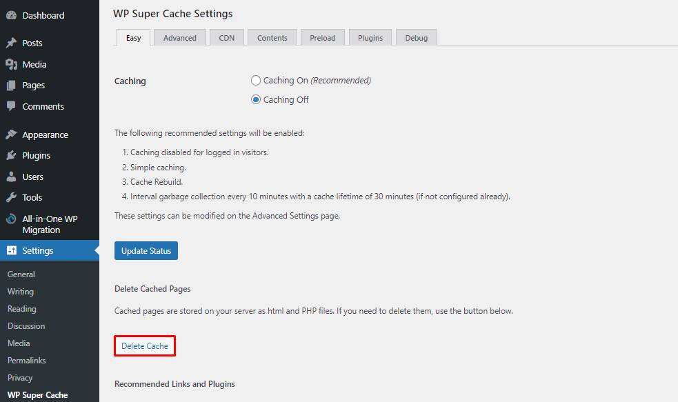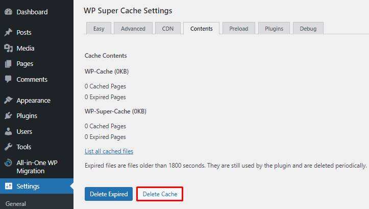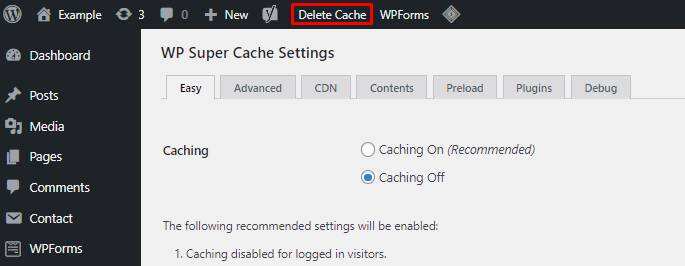 另一个选项是转到仪表盘 -> 设置 -> WP Super Cache,然后单击删除缓存按钮。