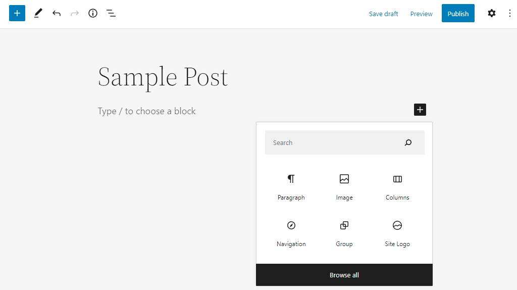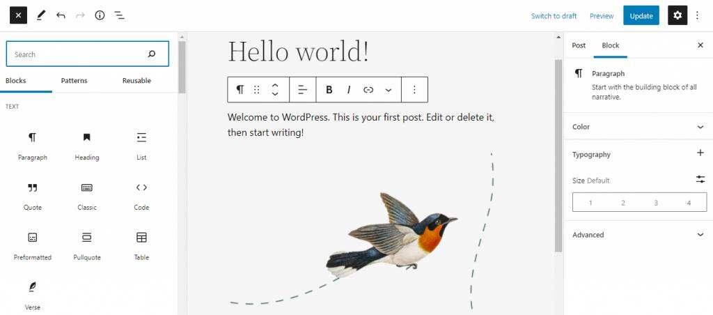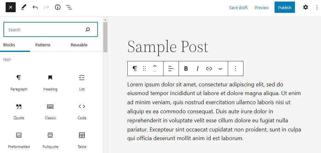 添加新的博客文章或页面时,编辑器将默认提供一个段落区块,以便您可以立即开始写作。当您按Enter时,段落区块也是默认的新区块,使编写过程无缝。