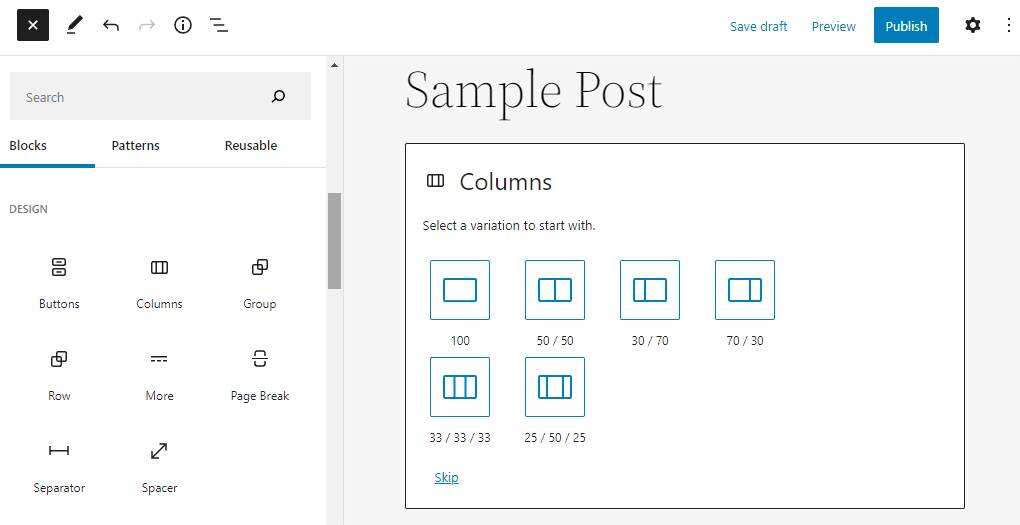 例如,使用栏目区块创建侧边栏。您可以将页面宽度划分为 70:30 的比例,将内容添加到较大的一侧,并将WordPress小工具和其他元素插入到较小的一侧。