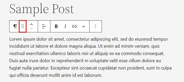 要重新排列区块,WordPress区块编辑器具有拖放功能。选择任何区块,单击其工具栏上的拖动图标,然后将其放在所需的位置。