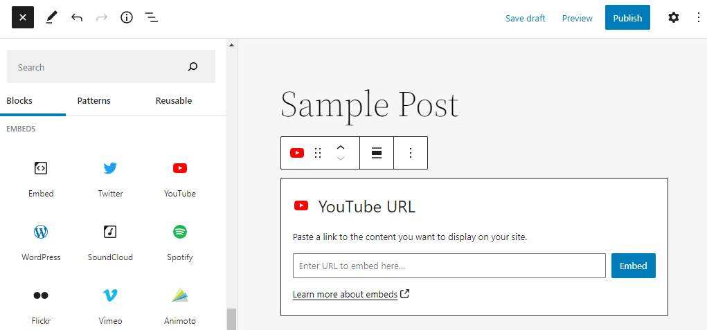 新的区块编辑器可让您通过复制和粘贴URL轻松嵌入外部内容。例如,有一个用于嵌入YouTube视频的专用区块。