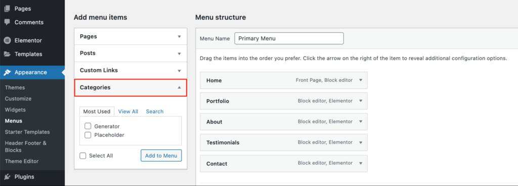 类别也可以添加到网站菜单中,就像页面一样。当您前往仪表盘-> 外观-> 菜单时,您会在添加菜单项下找到分类。