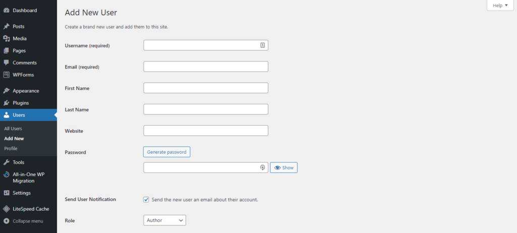 前往仪表盘 -> 用户 -> 添加新的。确保填写网站上显示的用户名、电子邮件地址,并将角色更改为作者。