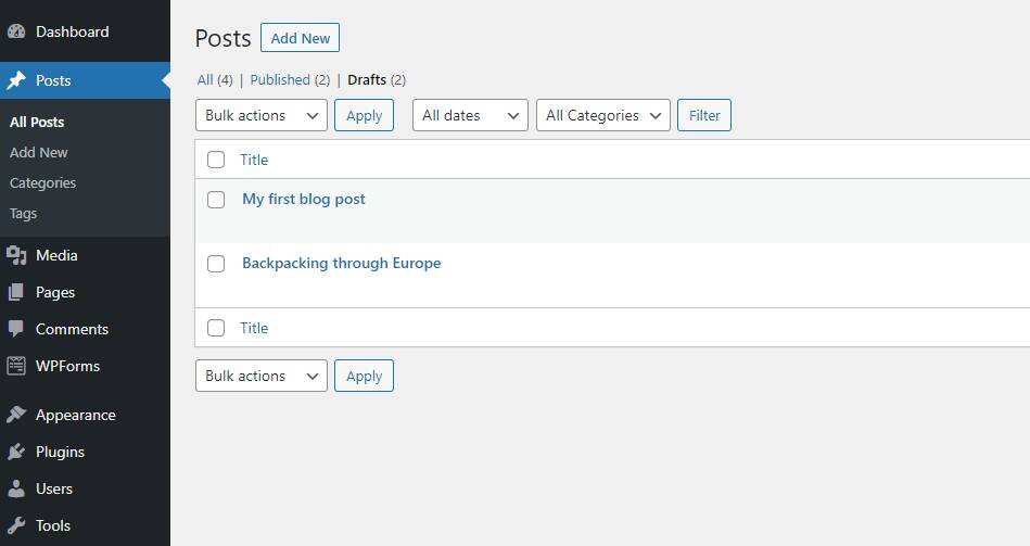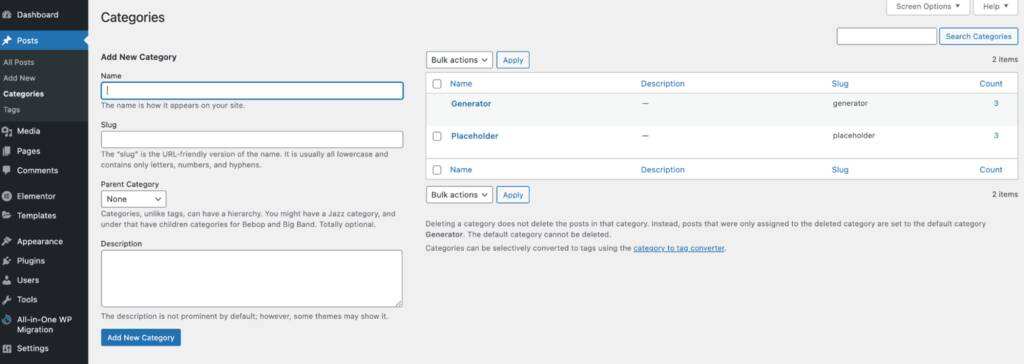 要添加新类别或标签,请转到仪表盘 -> 文章 -> 分类或标签。从那里,编辑名称、URL slug和描述,并查看分类和标签下的所有文章。