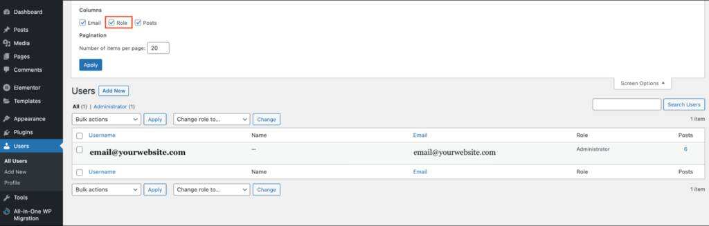 要查看WordPress网站上的所有作者,请前往所有用户并确保在屏幕选项选项卡上选中角色。在那里,您将能够看到所有用户和角色。