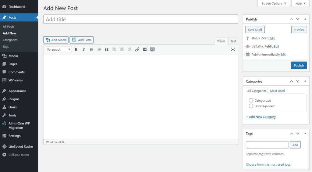 有多种方法可以添加新的WordPress文章,所有这些方法都将引导您进入可视化编辑器。