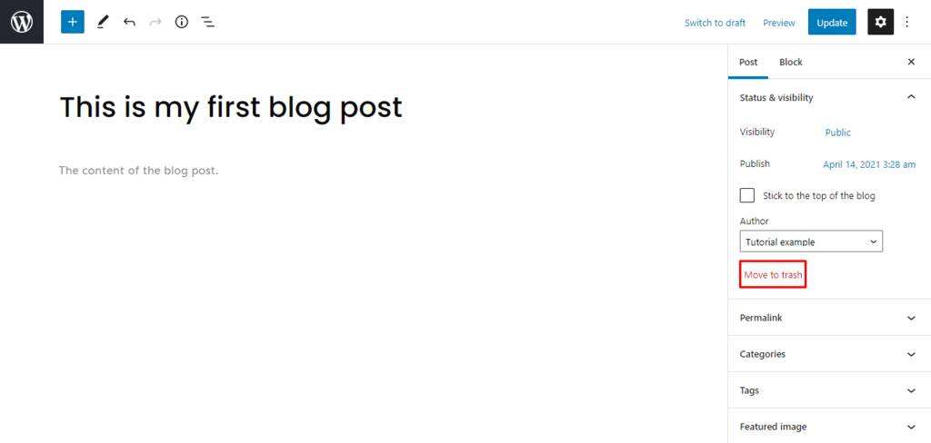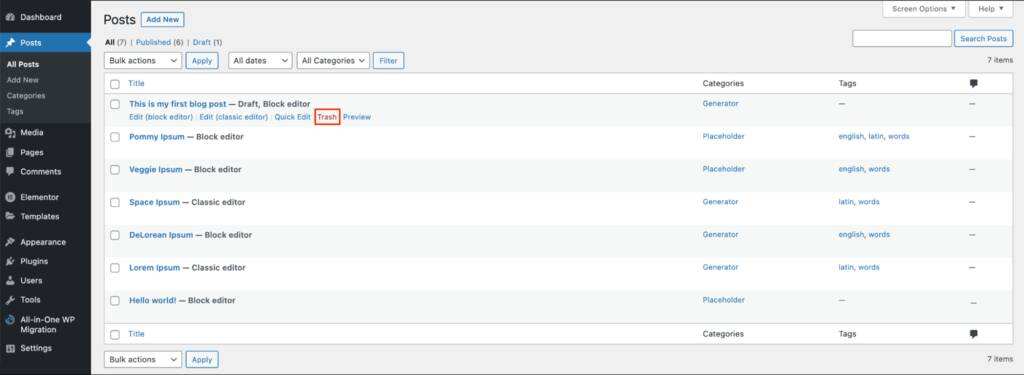 另一种方法是转到仪表盘-> 文章-> 所有文章,将鼠标悬停在文章上,然后单击移至回收站。