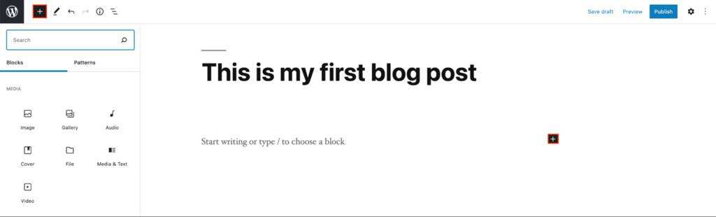 标题上的“+”符号下还有一个添加媒体按钮。添加媒体也可以通过区块。再次单击“+”号,然后前往媒体部分。