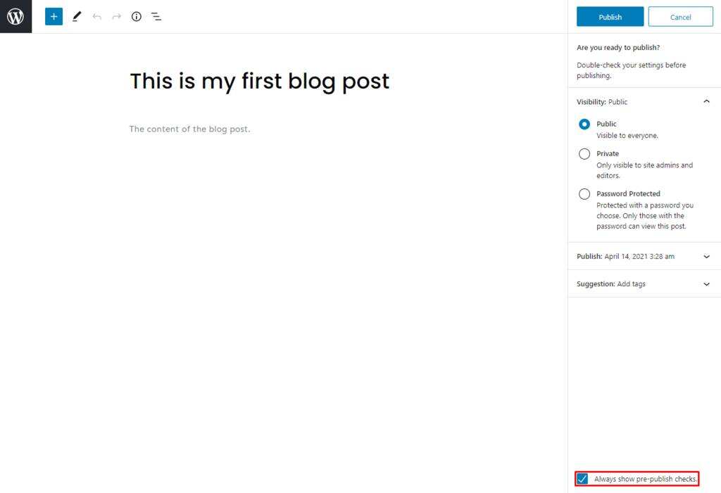 现在您已了解所有选项和流程,是时候发布文章草稿了。当您单击“发布”按钮时,它将显示文章的可见性、发布日期和时间以及来自WordPress的建议。