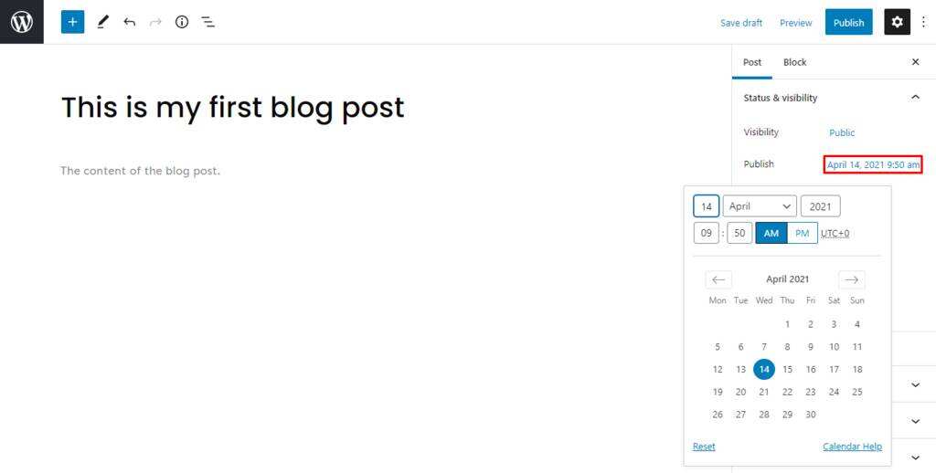 它将显示一个日历和一个选项来更改确切的分钟、小时、日、月和年。确保在发布之前检查时区。