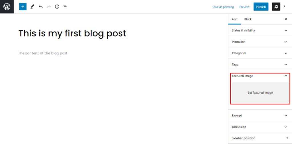 要添加特色图片,请前往设置 -> 发布 -> 特色图片 -> 设置特色图片。您将被定向到媒体库,您可以在其中选择图像。
