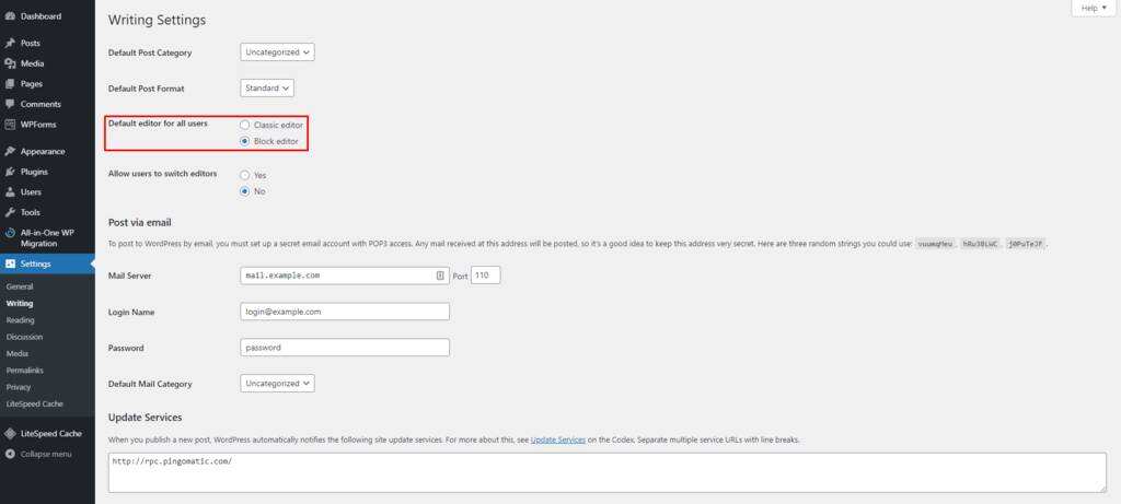 首先,确保下载您缺少的编辑器的插件。然后,前往您的仪表盘 -> 设置 -> 编写并更改“所有用户的默认编辑器”设置。