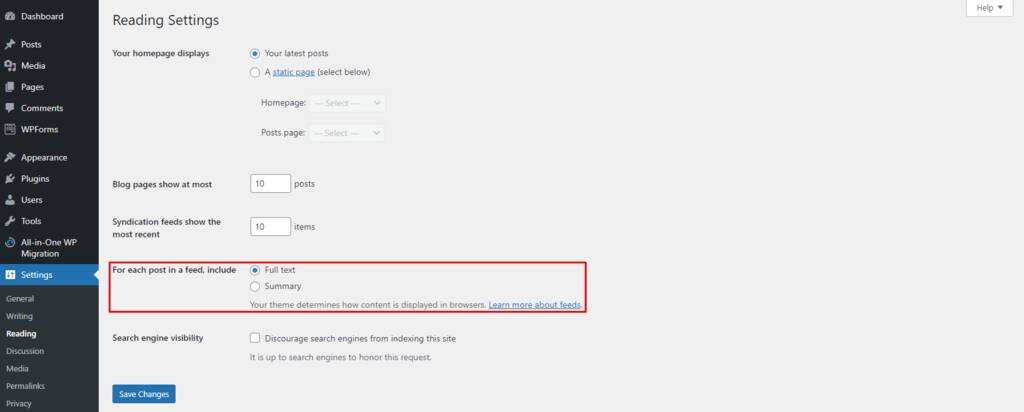 要在博客页面上显示摘录,请前往仪表盘 – >设置 – > 阅读。然后,在对于feed中的每篇文章,包含选择摘要。