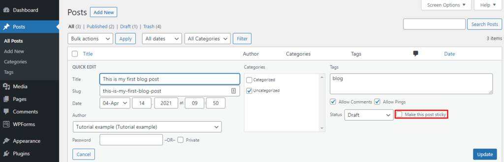 更改文章的置顶文章功能的另一种方法是转到仪表盘 -> 文章-> 所有文章。从那里,单击文章下方的快速编辑,然后勾选使此文章置顶选项。