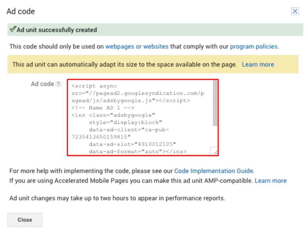 9. 按保存并获取代码。将出现一个包含您的AdSense代码的新窗口: