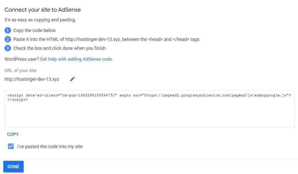 1. 在将您的网站连接到AdSense页面上,您应该将一组代码嵌入到您网站的标题中。记住,只复制代码,不要点击Done。避免关闭页面,以及。
