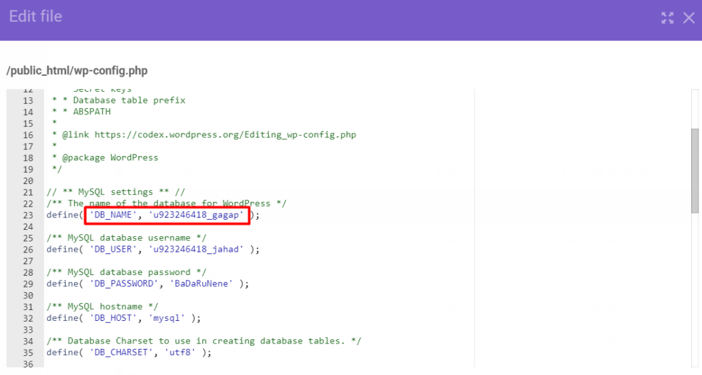 3. 打开wp-config.php并搜索DB_NAME。此参数的值是您的数据库名称。例如,我们的MySQL数据库的名称是u923246418_gagap。